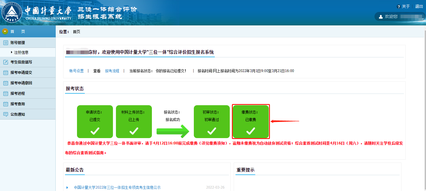 我校2022年三位一体招生书面评审结果已公布,请通过书面评审的考生按以下要求及时缴费: