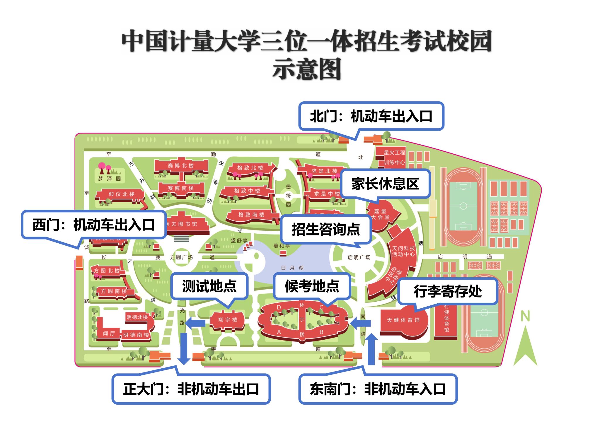 测试当天,陪同的家长可随考生凭测试通知书入校,家长休息区设在嘉量大会堂;学校在校园内启明广场(如遇雨天在嘉量大会堂)举办校园开放日活动,考生和家长可前往进行咨询;考生在测试结束后,可以自由参观校园。