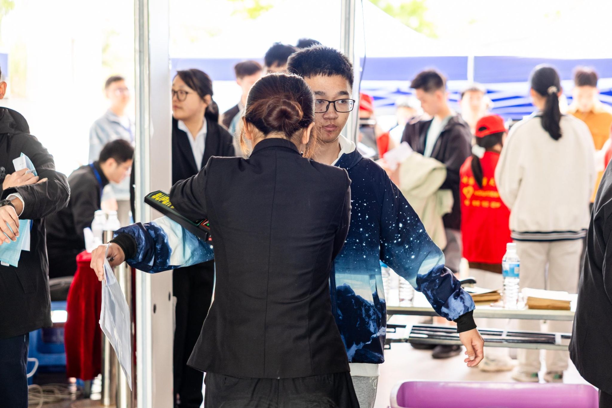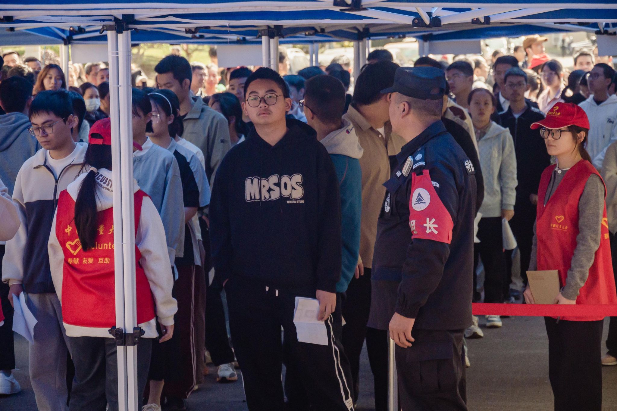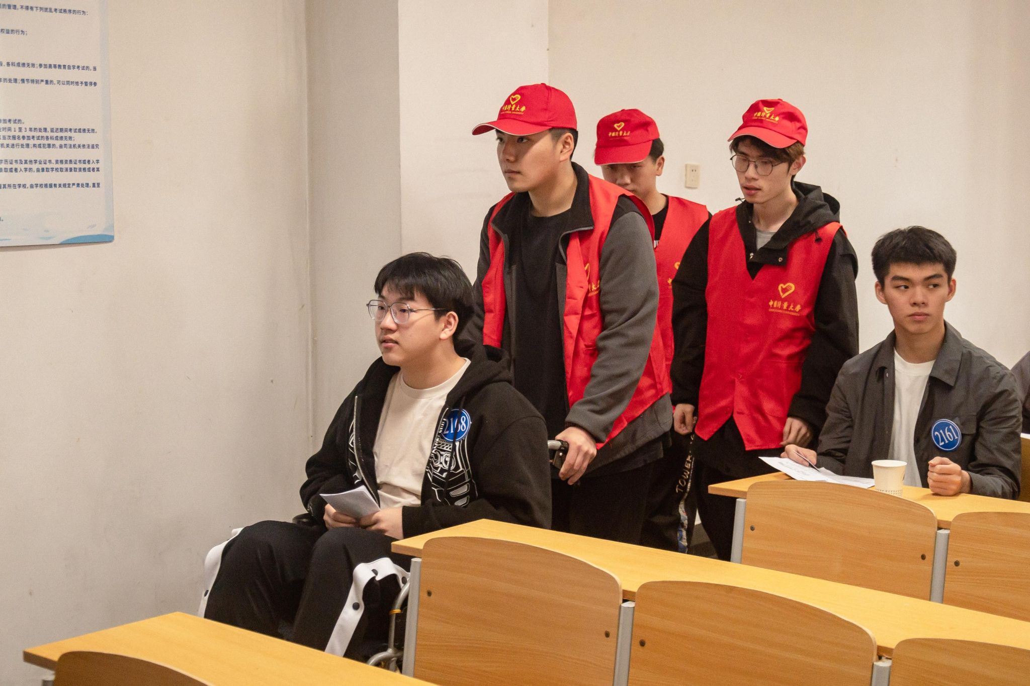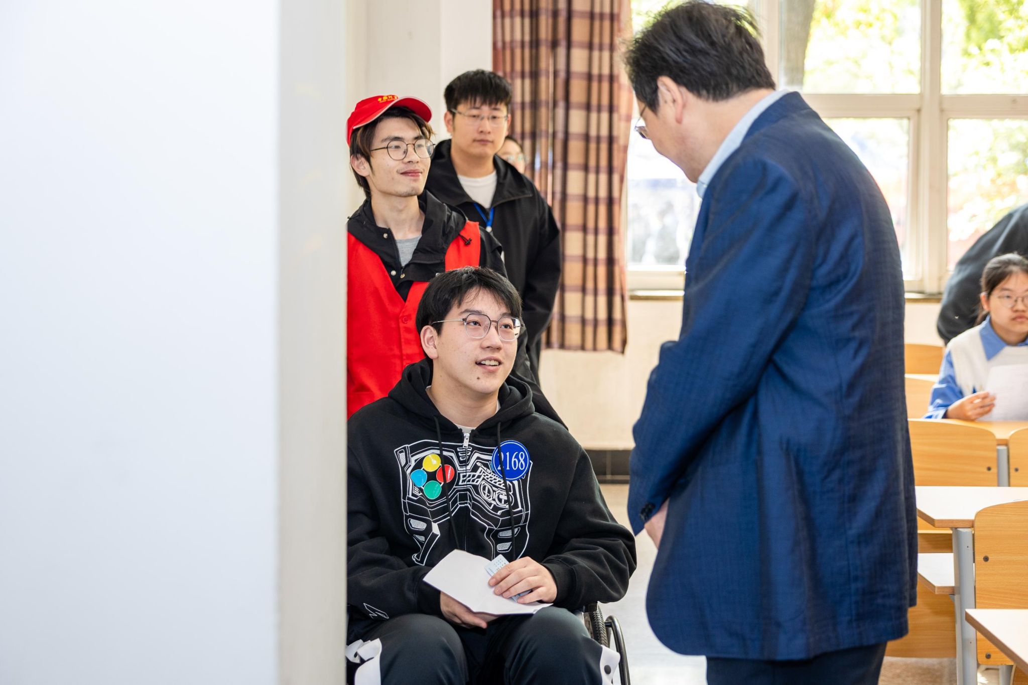 在众多学生中,今年有一位特殊的考生。来自萧山第三高级中学的胡同学在考试前腿部受伤,学校了解情况后立即安排工作人员全程陪同,志愿者们帮忙拿轮椅和物品,他的母亲也非常感激学校的帮助。坐在轮椅上的他没有紧张和担忧,“面试总体发挥得还不错,我的考场在三楼,有老师和志愿者一直帮助我,让我轻松了很多,我很喜欢中国计量大学的氛围,学校环境也很好,很憧憬!”