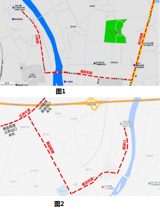 甬金高速义亭出口:经上佛路、五洲大道、朝阳西路、蟠龙东路、江滨路入校(见图2)。
